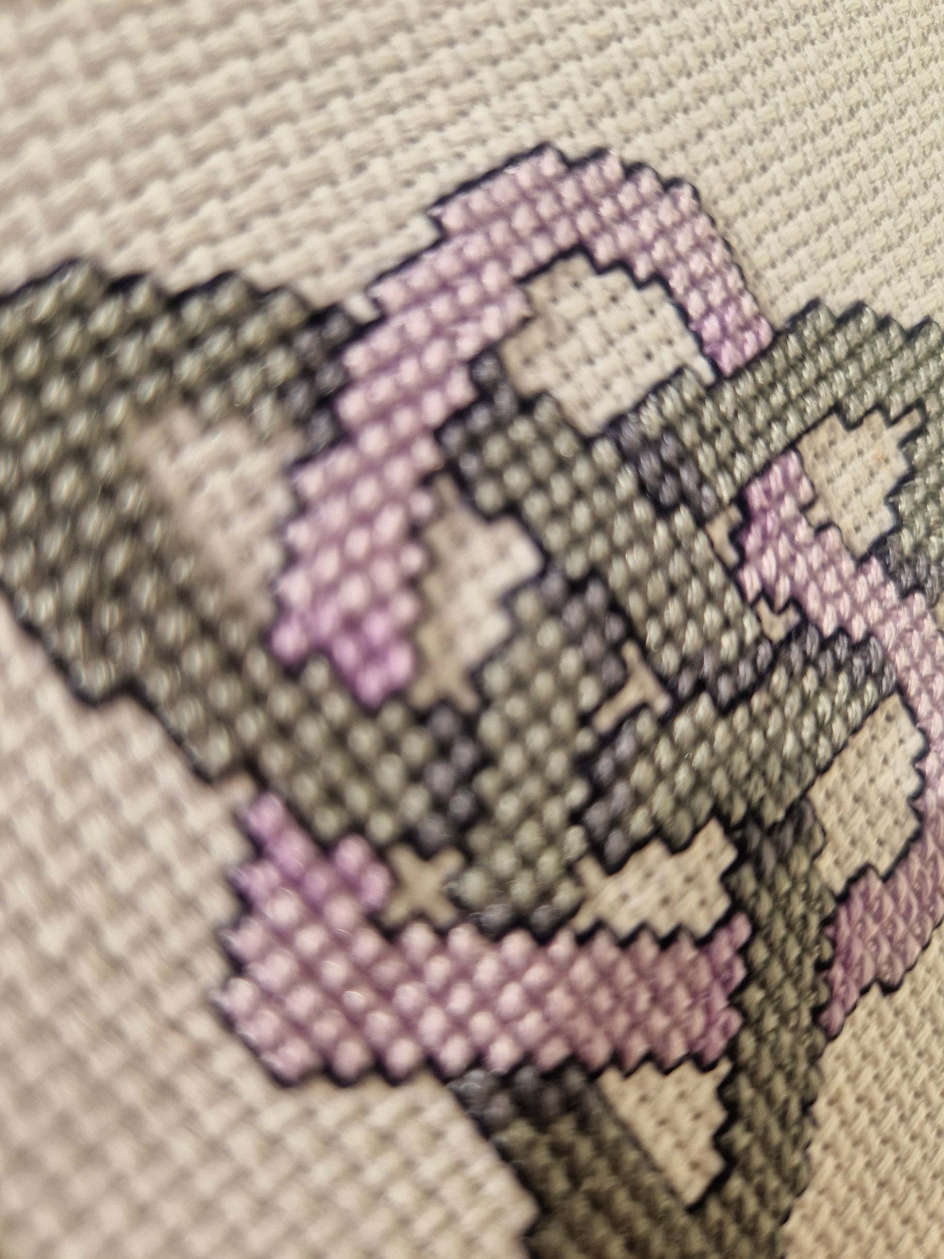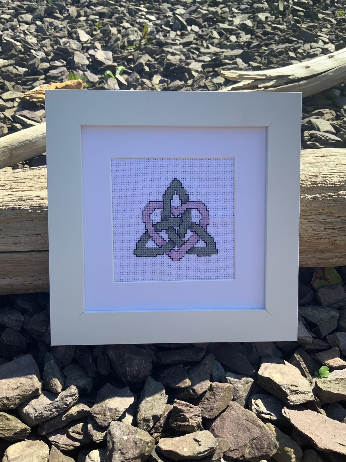 4" x 4" Grey and Lilac Cross Stitch Love Knot in a light cream 7.5" mounted frame. Can free stand or be wall mounted.