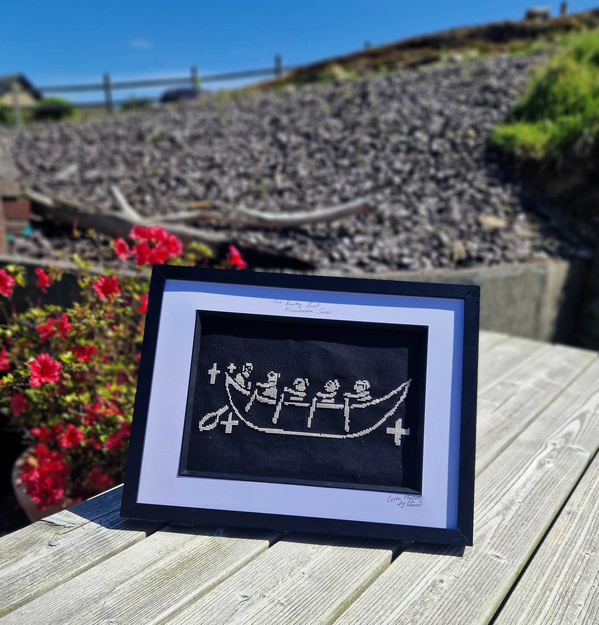 The Bantry Boat depicts four oarsmen and a coxwain rowing through a sea of crosses. This is thought to be one of the earliest depictions of a traditional Irish Currach, the skin covered boat that St. Brendan the Navigator may have used on his legendary voyage to the Amer u cas.