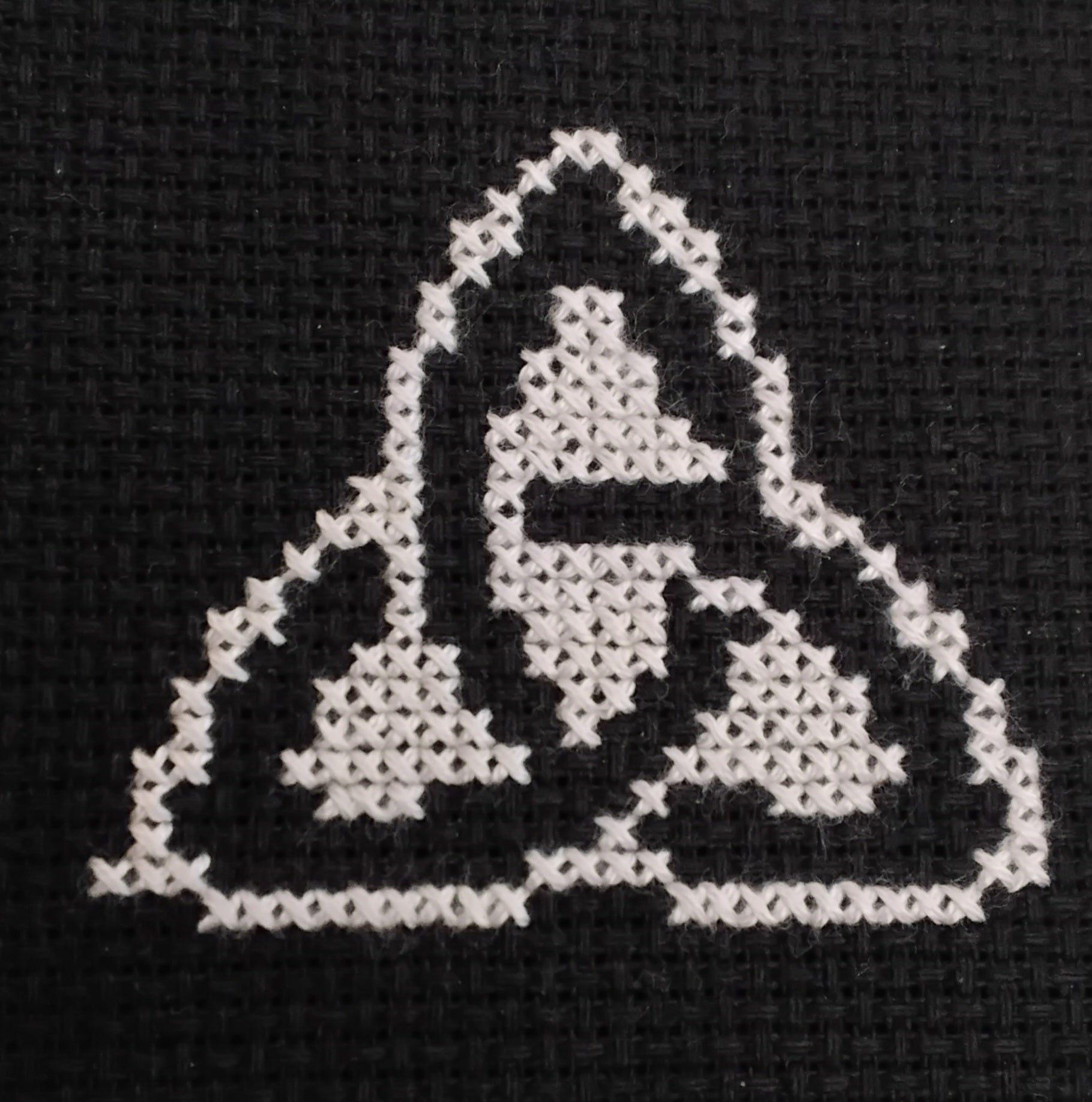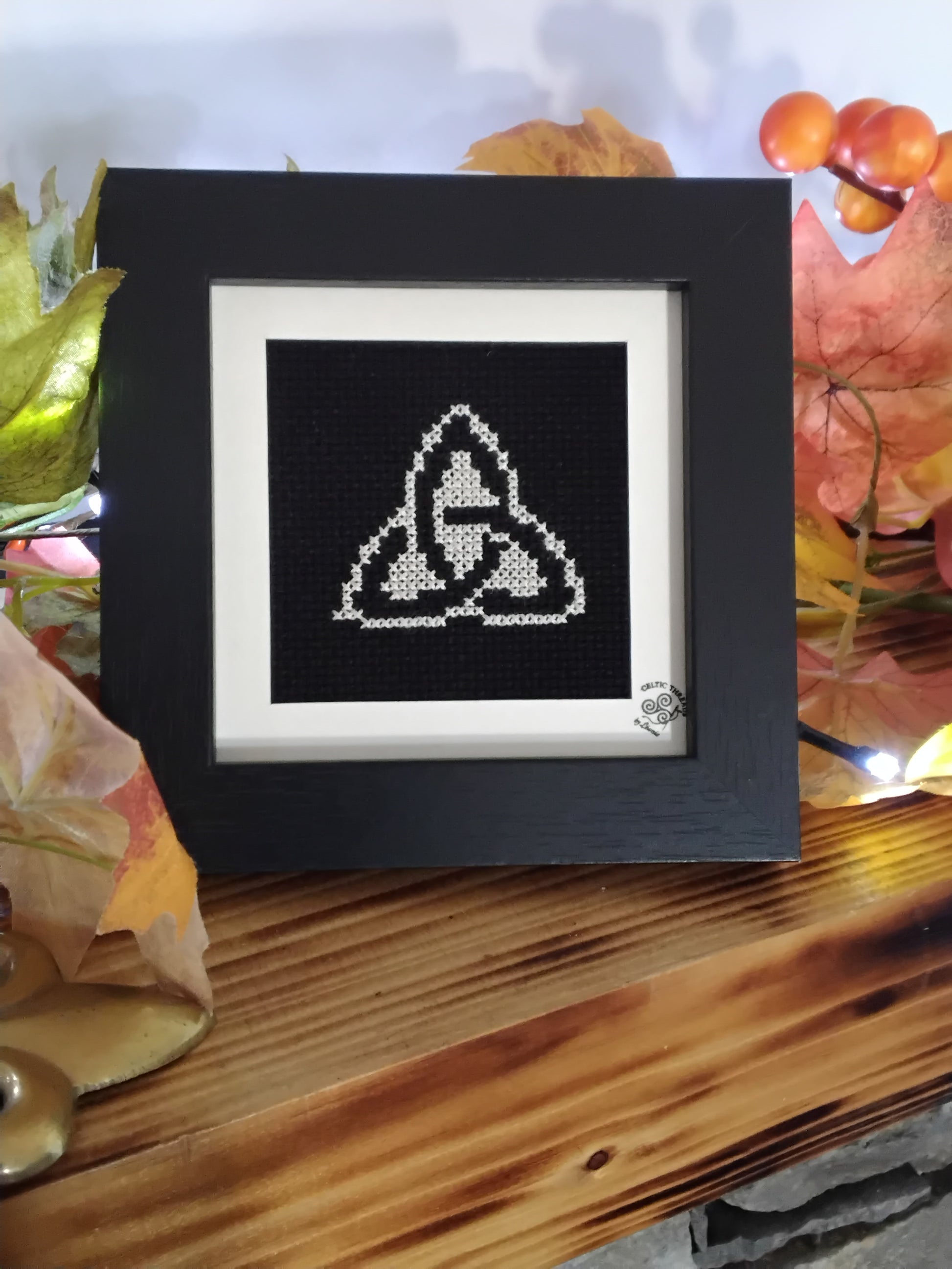 3" x 3" báinín on black aida, in a cream mount and 5" x 5" black wooden frame. Can be free standing or wall mounted.